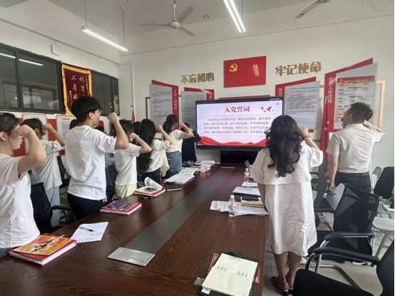 随后,活动进入重温入党誓词环节。在党支部书记的领誓下,全体毕业生党员面对鲜红的党旗,整齐肃立,举起右拳,用铿锵有力、饱含深情的声音,再次庄严宣誓,誓词声声,回荡在会议室中,也深深烙印在每一位党员的心中。这一刻,是对初心使命的重新叩问,也是对理想信念的再次坚定,更承载着对即将离开校园、投身社会的毕业生党员的殷殷嘱托与深深祝福。