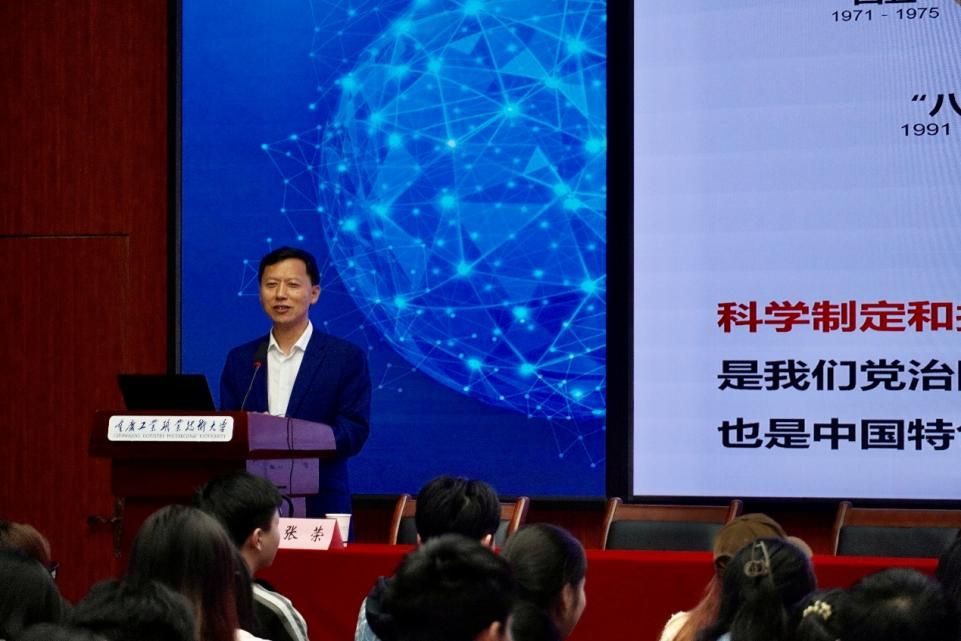 张荣副书记首先从历史维度讲解了一系列五年规划对推进社会主义现代化的辉煌历程与独特优势,展现了党领导人民一张蓝图绘到底的战略定力,为中国式现代化积累了坚实物质基础、制度保证与精神力量。然后围绕当前发展阶段,重点解读了“十四五”时期我国在经济发展、科技创新、改革开放等领域取得的重大成就,并结合“十五五”规划建议,系统阐述了未来五年经济社会发展所处的历史方位、面临的机遇挑战,以及以高质量发展为主题、以科技自立自强为支撑、以全体人民共同富裕为目标的战略部署。最后,张荣副书记特别强调,党的领导是中国式现代化的根本保证,中国式现代化为青年施展才干提供了广阔舞台,师生们要将个人理想融入民族复兴伟业,让青春奋斗的步伐与国家现代化的节奏同频共振。
